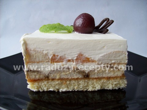 Vychladlý plát pomažeme broskvovým džemem a poklademe piškoty. Instantní kávu zalijeme vroucí vodou, přidáme rum a nalijeme rovnoměrně na piškoty. Na piškoty navrstvíme polovinu krému, poklademe znovu piškoty a ty poté posypeme rozkrájenými broskvemi. Navrstvíme zbylý krém, uhladíme a necháme v lednici odležet přes noc.